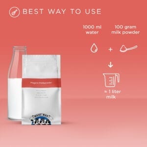 100 gram milkpowder and 1000 ml water makes approx. 1 liter milk.