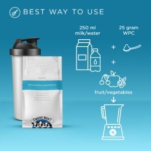 To make a protein shake, dissolve approx. 25 grams of whey concentrate in 250 ml of milk, water, juice or other drink of your choice.