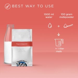 Voor het maken van een liter melk lost u ca. 100 gram melkpoeder op in 1000 ml water.